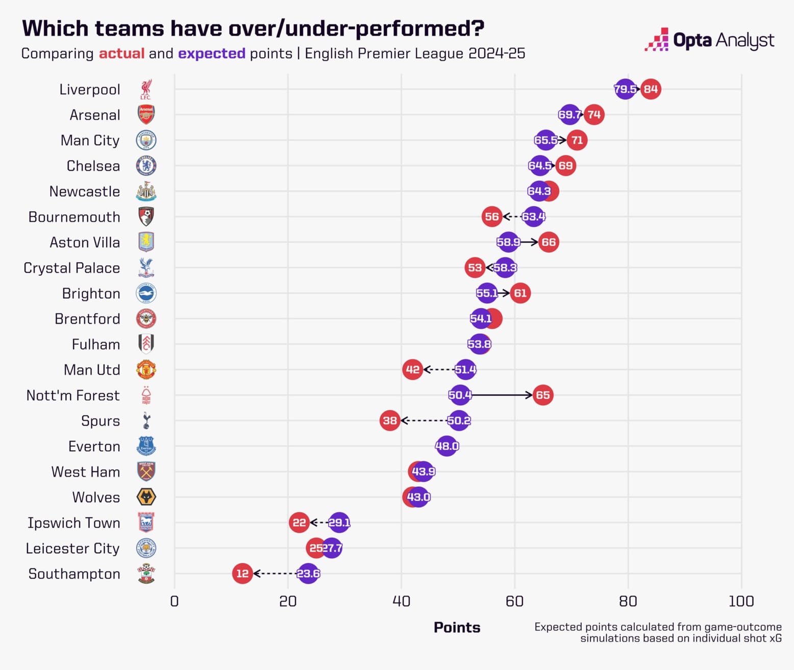 First as we can see in the above graph most teams finished where they could be expected to or thereabouts. Bournemouth, Palace, Forest are the only three significant deviations. It’s interesting as although Bournemouth were good I'm not sure if they were the sixth best team for me and now with how raided they have been I'm not sure it matters anyway. Palace as well were a team of two halves as I pointed out in the end of season review article. No major losses yet means they don't need much if they can pick up where they left off which was a top 4 challenger in the second half of the season. Forest as well is one where XG usually devalues their playstyle. Counterattacking teams that soak up pressure and more shots even if of a lower quality tend not to rank as high. They, similar to Palace were a team of two halves going the other way and losing Elanga is big so the XG table could actually help me here bring their numbers back down to earth.